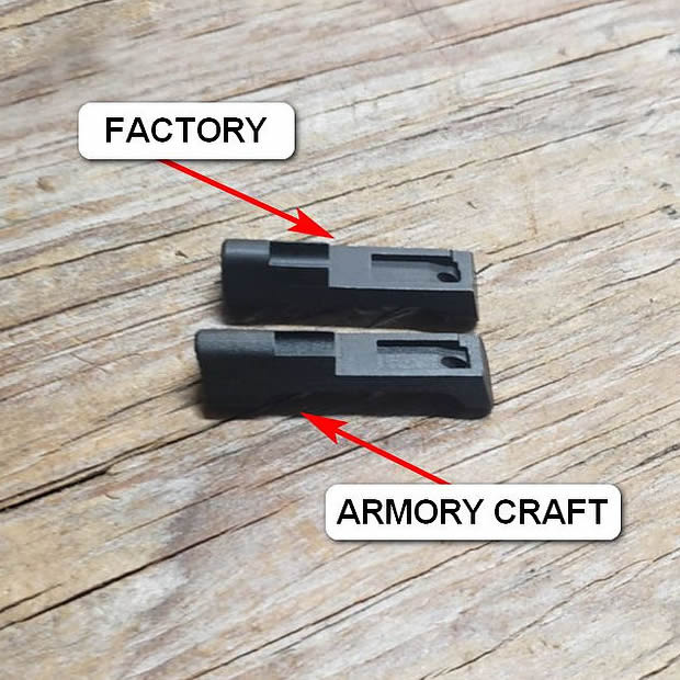 Please note: only the extended button itself is included - you will need to re-use the small factory 'wedge' as well as the spring from the original magazine button.